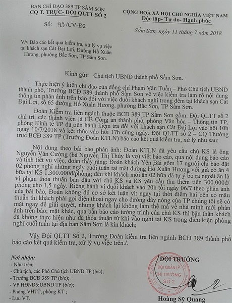 Theo đó, ngày 12.7, Ban chỉ đạo 389 TP sầm Sơn đã có báo cáo kết quả kiểm tra làm rõ nội dung về vụ việc nêu trên. Nội dung báo cáo kết quả kiểm tra xác minh nêu rõ: Liên quan đến nội dung phản ánh của mạng xã hội trong thời gian qua, Đoàn kiểm tra liên ngành đã yêu cầu chủ khách sạn là ông Nguyễn Văn Cường và bà Nguyễn Thị Thúy tường trình và qua nội dung báo cáo, tình tiết vụ việc, Đoàn kiểm tra liên ngành thấy rằng: Đoàn khách Yên Bái gồm 17 người chỉ báo đặt 2 phòng nghỉ những ngày cuối tuần tại mặt đường Hồ Xuân Hương với giá có ăn 4 bữa tại khách sạn 1.300.000/phòng, đến khi khách mới ăn có 2 bữa đã tự ý bỏ ra ngoài ăn là vi phạm thỏa thuận với chủ khách sạn và khách sạn đã yêu cầu thu thêm tiền là 300.000/phòng cho 1,5 ngày.