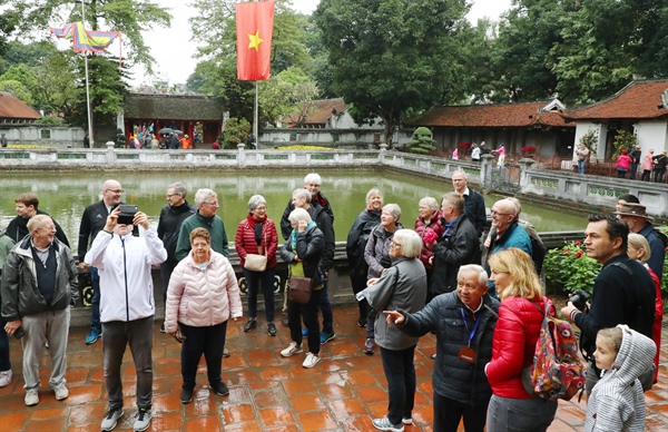Du khách nước ngoài tham quan Văn Miếu - Quốc Tử Giám tháng 2.2020 Ảnh: TR HUẤN