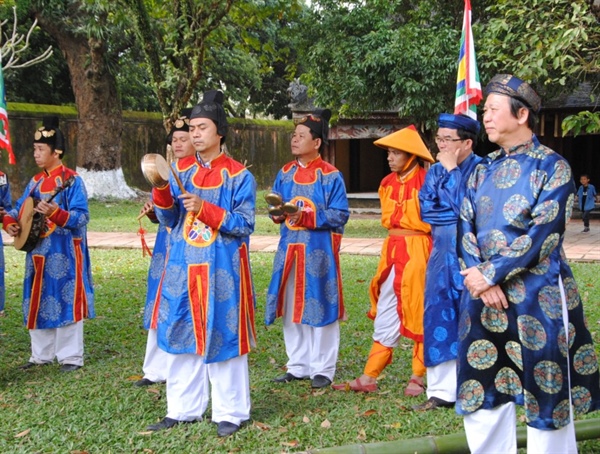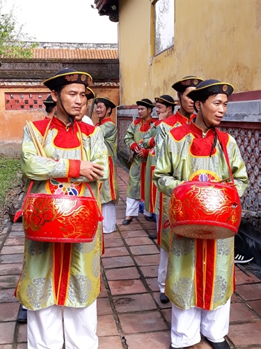 Các nghệ sĩ của Nhà hát Nghệ thuật truyền thống cung đình Huế biểu diễn Nhã nhạc tại lễ hạ nêu.