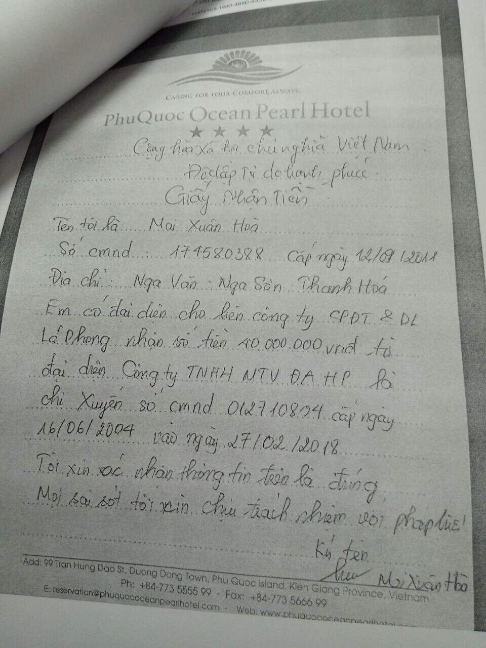 Làm việc với phóng viên Văn Hóa, ông Nguyễn Huy Đông, Giám đốc Công ty TNHH Du lịch và Vận tải Minh Quân (Công ty Minh Quân), có trụ sở tại phòng 322 tòa nhà 132 Lê Duẩn, Hà Nội cho biết: Ngày 23.2.2018, có người đàn ông tên là Mai Xuân Hòa đã liên hệ qua điện thoại với Công ty Minh Quân xưng là người đại diện của Công ty ĐAHP để đặt 5 chuyến xe 45 chỗ đời mới đưa khách từ nội thành Hà Nội ra sân bay Nội Bài vào sáng ngày 24.2.2018 và 5 chuyến chiều ngược lại vào ngày 28.2.2018 với số tiền của tổng hai lượt đón là 13 triệu đồng.