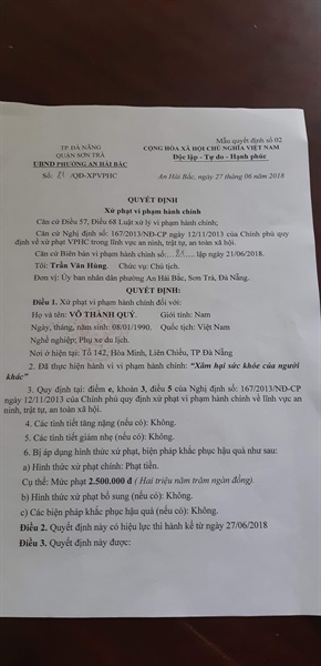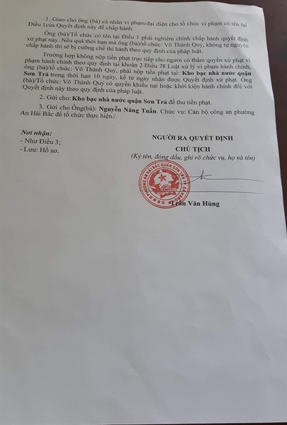 Quyết định xử lý vi phạm hành chính của CA P. An Hải Bắc