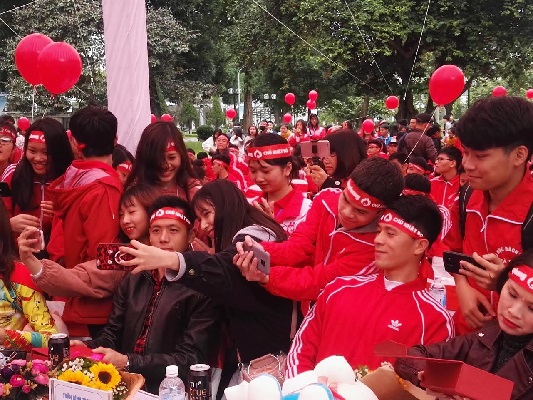 Đi hiến máu, các bạn trẻ tranh thủ giao lưu, chụp hình, xin chữ ký của cầu thủ Đình Trọng và Văn Quyết