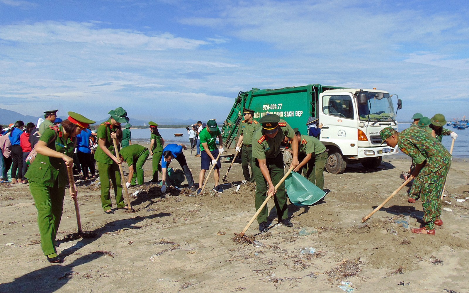 Trong buổi sáng cùng ngày, hơn 300 đoàn viên thanh niên (ĐVTN) là các cán bộ chiến sĩ công an, bộ đội biên phòng, ĐVTN Tỉnh đoàn Quảng Nam cùng với người dân địa phương đã ra quân thu gom rác thải, dọn dẹp vệ sinh môi trường, làm sạch tại bãi biển Thuận An, xã Tam Hải.
