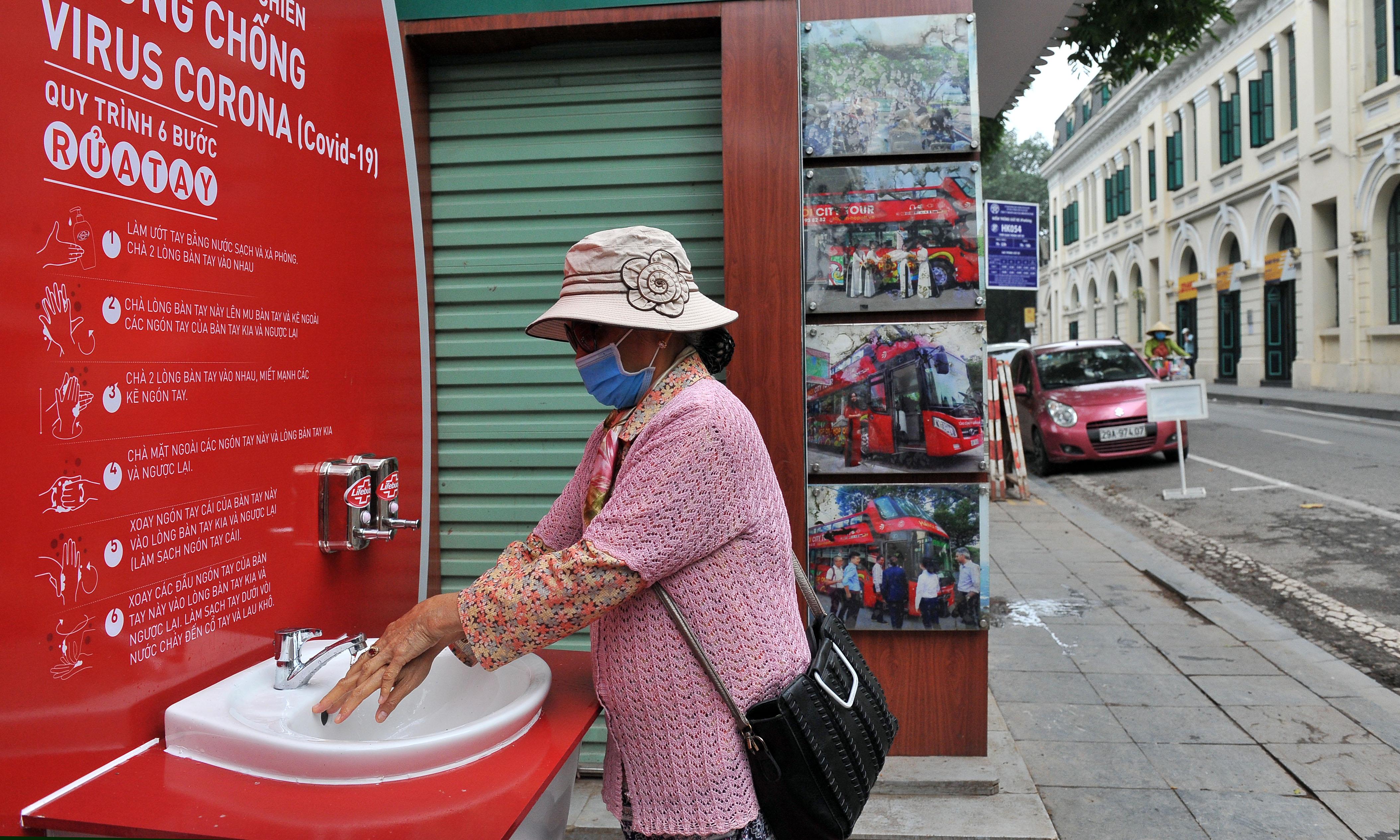 Rửa tay tại trạm rửa tay dã chiến khu vực Tượng đài Lý Thái Tổ