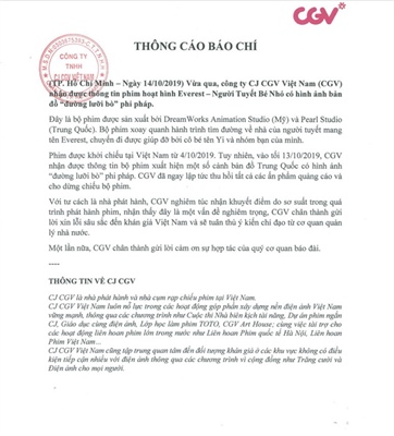 Chiều 14.10, công ty CJ CGV Việt Nam đã có phản hồi với báo chí về việc bộ phim hoạt hình Everest: Người tuyết bé nhỏ có hình ảnh bản đồ “đường lưỡi bò” phi pháp xuất hiện trong bản chiếu tại rạp Việt Nam.