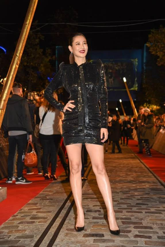 Cùng diện đồ sequin như Claudia Kim, nhưng Zoe Kravitz lại tạo điểm nhấn với phần váy quây màu hồng tô điểm thêm làn da nâu khỏe khoắn, quyến rũ của cô. Nữ diễn viên được tháp tùng bởi vị hôn phu Karl Glusman tại sự kiện ở Paris