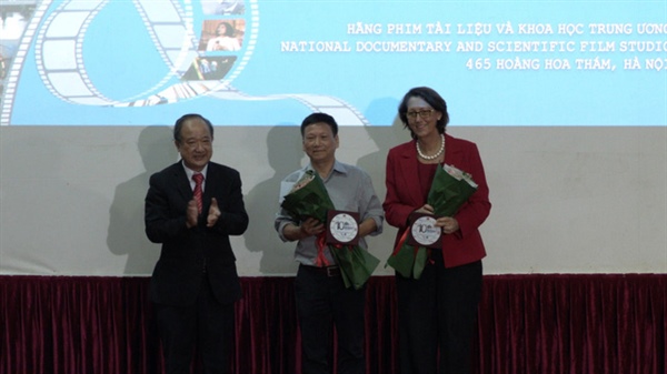NSND Nguyễn Như Vũ trao Kỷ niệm chương cho đại diện hai bộ phim tài liệu được trình chiếu mở màn LHP Tài liệu châu Âu - Việt Nam lần thứ 10