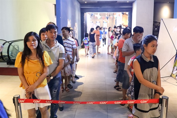 Phụ huynh và thiếu nhi xếp hàng dài trước rạp chiếu phim CGV Lapen Center ở TP Vũng Tàu.