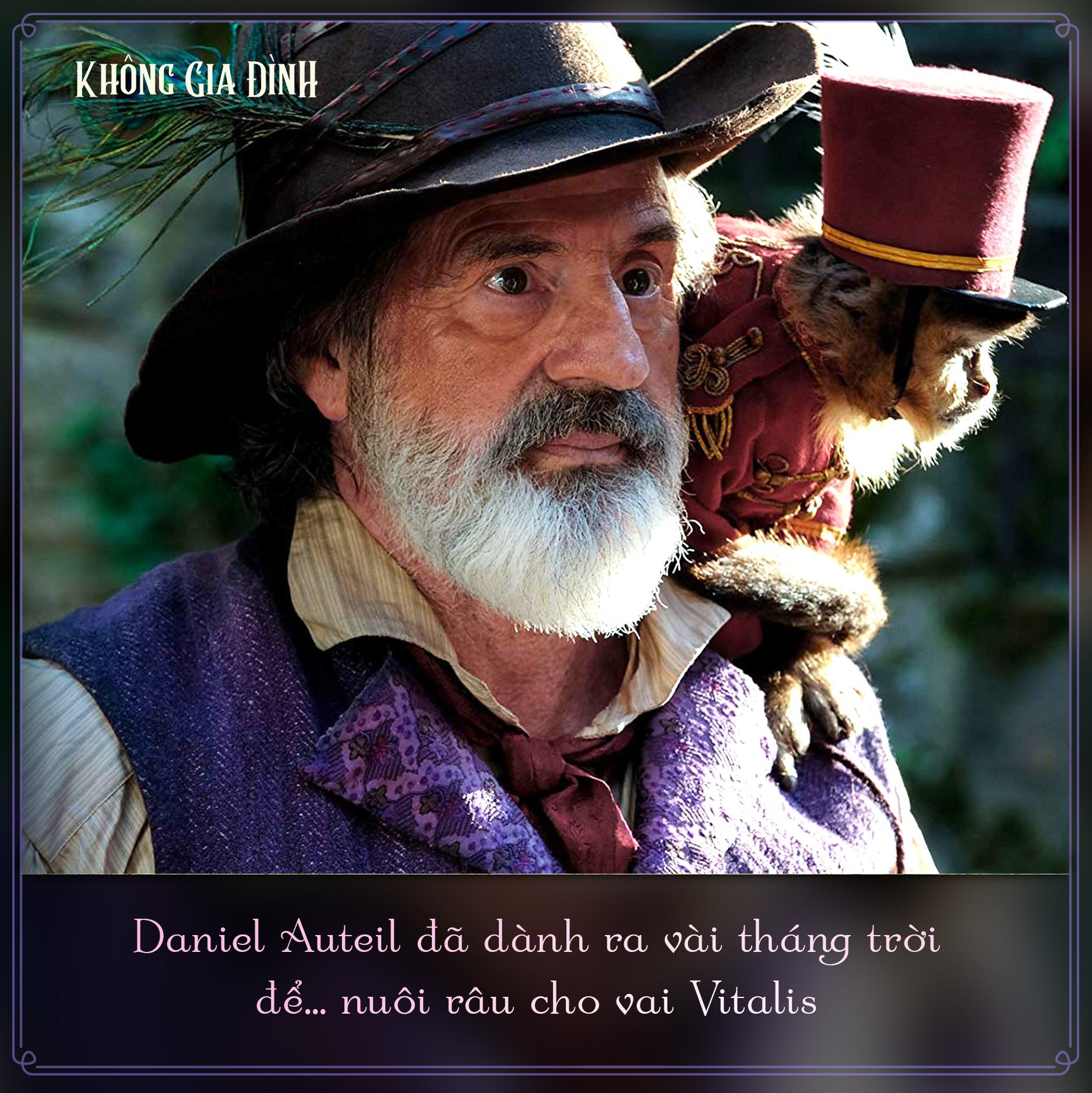Nam diễn viên Daniel Auteil – người thủ vai ông bầu của gánh xiếc rong Vitalis đã dành nhiều tháng trời trước khi bộ phim Không gia đình khởi quay để… nuôi râu cho tạo hình của mình trong phim. Ngoài công tác chăm sóc diện mạo, Daniel Auteil còn bỏ nhiều thời gian và công sức để tập luyện với cậu bé Maleaume Paquin và những bạn diễn đặc biệt: chú chó Capi và khỉ Joli-coeur. “Vitalis là người đàn ông bị ăn mòn bởi cảm giác tội lỗi. Ông ta yêu thương Remi như con trai mình, và muốn truyền lại mọi điều mình biết cho cậu bé như thể muốn chuộc lại một phần lỗi lầm từ thời quá khứ. Vì vậy, Vitalis mang đến cho bộ phim rất nhiều cảm xúc.” – Daniel Auteil nói.
