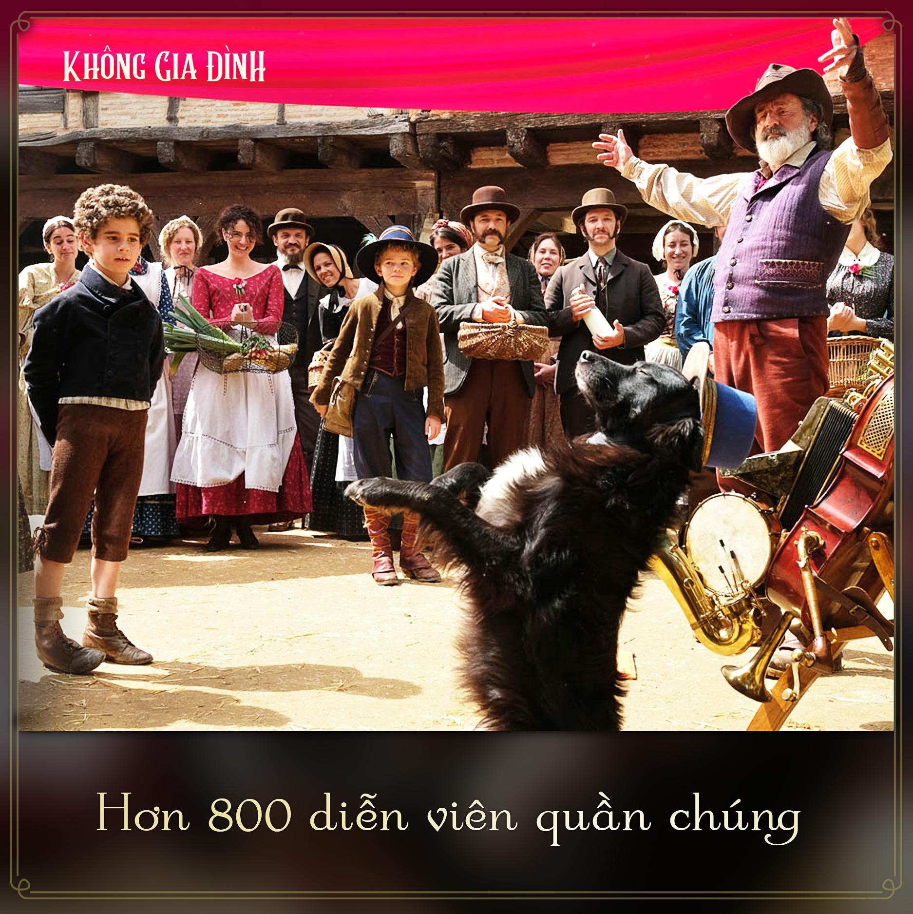 Bên cạnh gánh xiếc và các diễn viên phụ như bà Barberin, phu nhân Harper và cô bé Lise của thuyền Thiên Nga, Không gia đình cần tới hơn 800 diễn viên quần chúng, đặc biệt là các phân cảnh về những buổi biểu diễn của thầy trò Remi, những khu chợ nhộn nhịp, hay là phiên tòa xét xử Vitalis. Các diễn viên quần chúng, dù chỉ xuất hiện với thời lượng eo hẹp, song họ đã tự đầu tư rất nhiều. Đoàn làm phim đã yêu cầu những người đàn ông phải nuôi râu tóc, phụ nữ cần tập luyện cách di chuyển sao cho thật duyên dáng. Tất cả những diễn viên ấy vô cùng nghiêm túc, họ hòa mình vào bối cảnh và khung thời gian của bộ phim như thể thực sự thuộc về nơi ấy vậy.