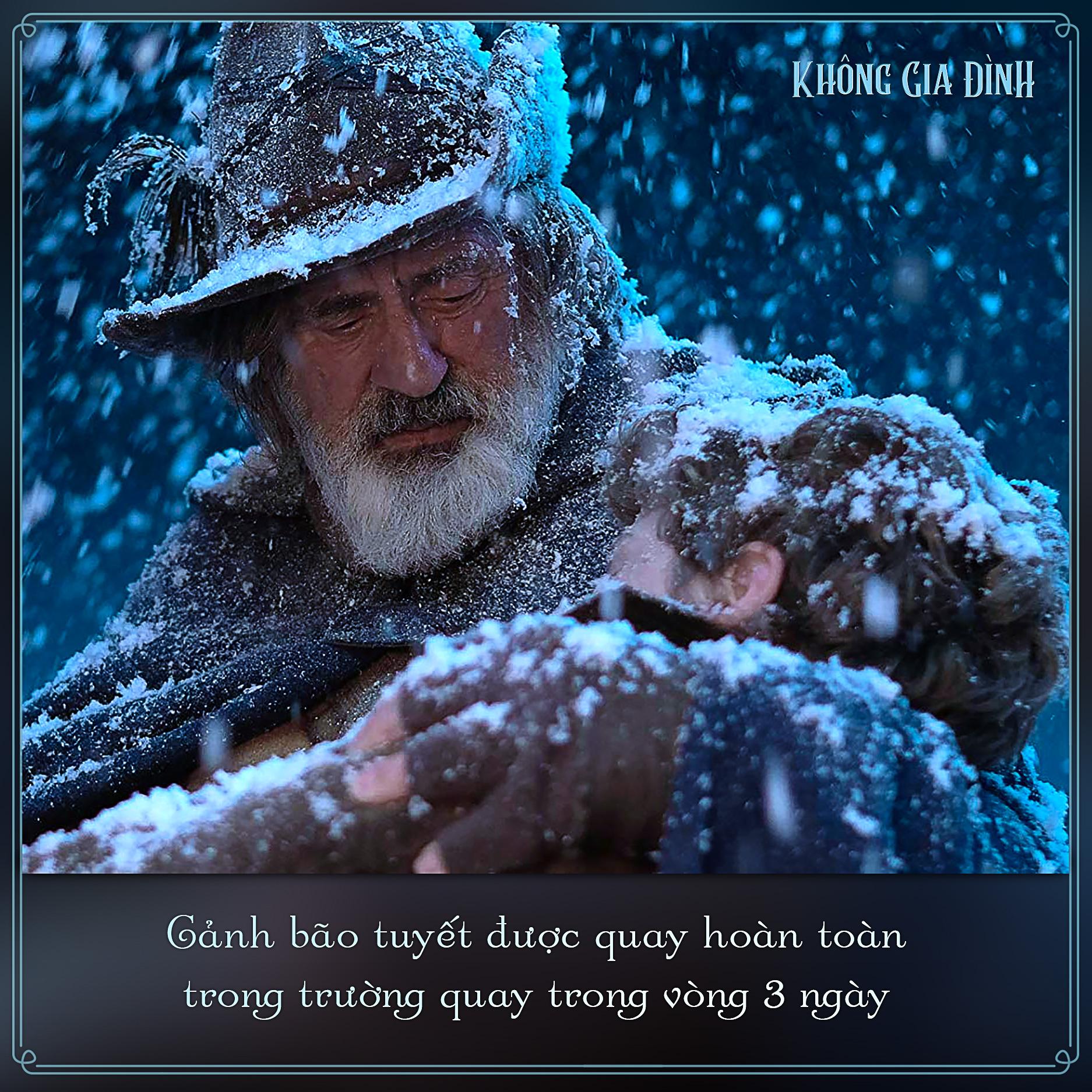 Phân cảnh được cho là xúc động nhất của Không gia đình chính là cảnh đoàn xiếc chìm trong bão tuyết khi đang cố gắng đưa Remi về với gia đình thực sự của mình. “Đó là một cảnh rất phức tạp. Chúng tôi đã phải tính toán kỹ lưỡng: phông nền phải dùng loại gì, loại tuyết nào sẽ bắt sáng trên máy quay và truyền tải được cảm giác về chiều sâu, khi mà trên thực tế các diễn viên chỉ diễn cách bức tường có 18 mét”. Tất cả người và các con thú lê bước trên băng chuyền trong hàng giờ đồng hồ, bị gió tạt và hàng tấn tuyết giả ném vào mặt từ mọi hướng, điều đó thật chẳng dễ chịu gì song họ đã chịu đựng điều đó suốt nhiều ngày trời.