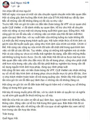 Cảm ơn Liên đoàn bóng đá Việt Nam (VFF) và cơ quan chủ quản CLB Viettel, đã dành nhiều sự quan tâm, hỗ trợ trong thời gian qua, Quế Ngọc Hải cũng gửi lời xin lỗi sâu sắc tới 2 đơn vị này vì những lùm xùm của Hải trong việc vi phạm bản quyền.