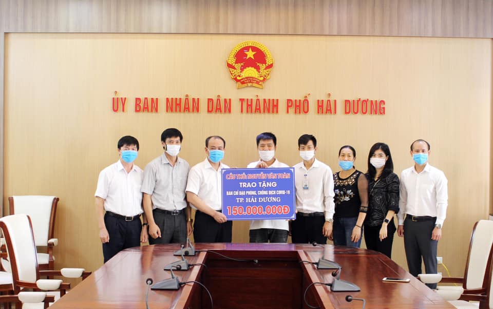 Gia đình Văn Toàn đại diện trao số tiền 150 triệu đồng cho Ban chỉ đạo phòng, chống dịch Covid-19 TP.Hải Dương