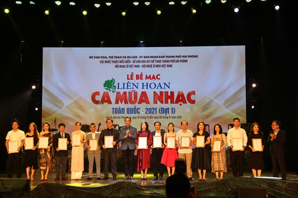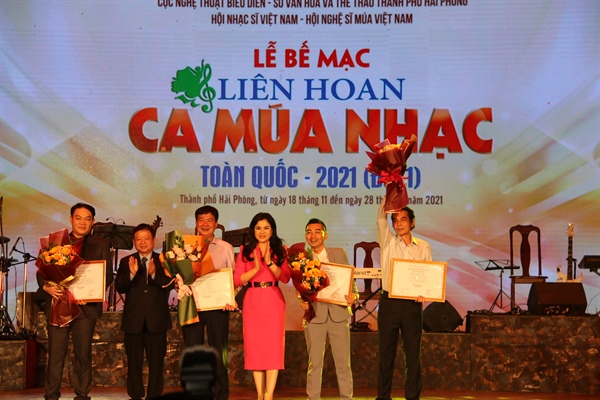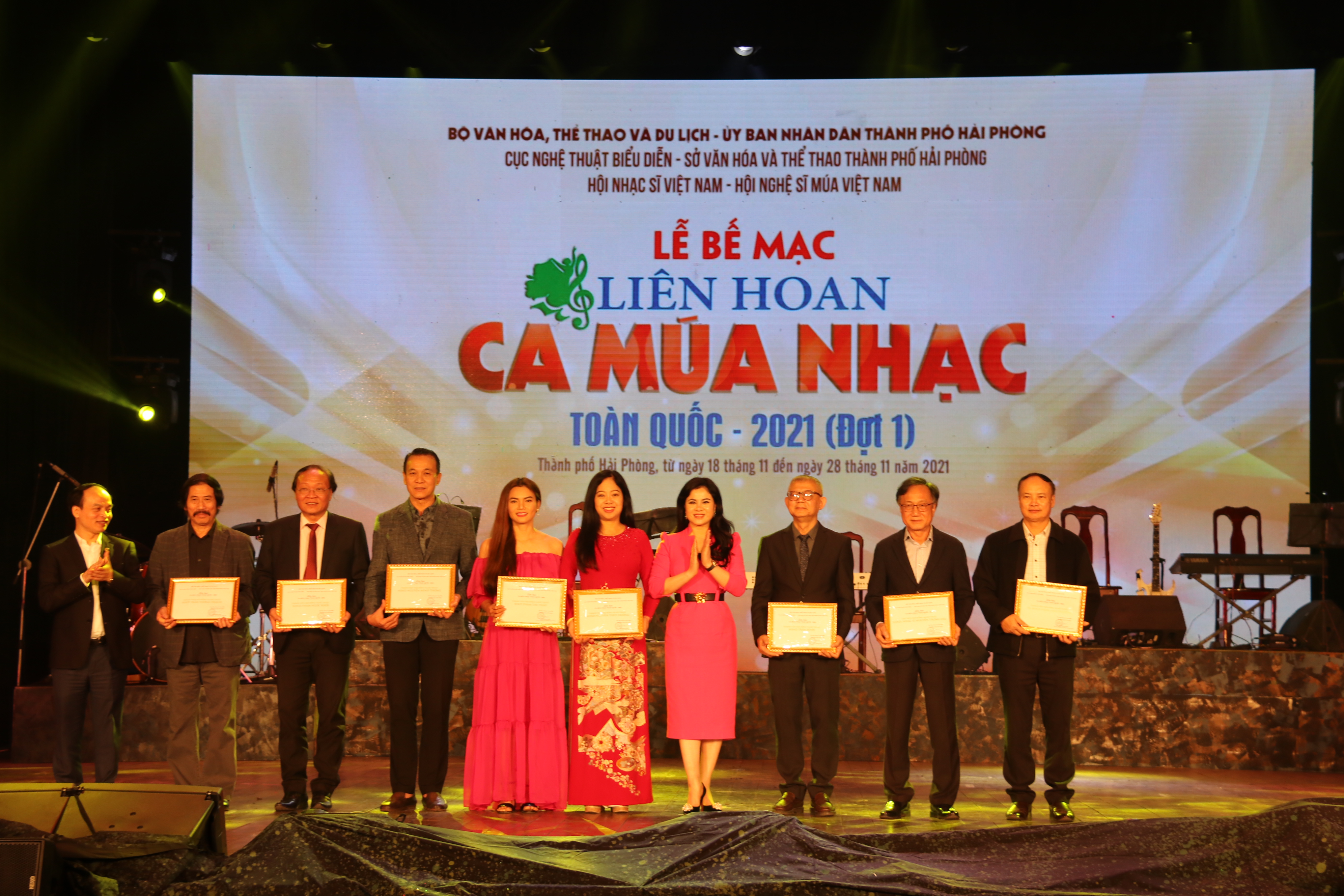 Chủ tịch Liên hiệp các Hội Văn học nghệ thuật Việt Nam, Chủ tịch Hội Nhạc sĩ Việt Nam, PGS.TS Đỗ Hồng Quân, Giám đốc Sở VH và TT thành phố Hải Phòng Trần Thị Hoàng Mai trao các Chương trình đoạt Huy Chương Bạc