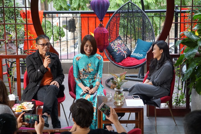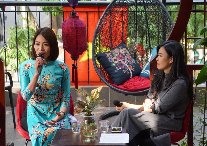 Ca sĩ Minh Thu (bên trái) trong buổi ra mắt MV “Ngày ta tìm về”