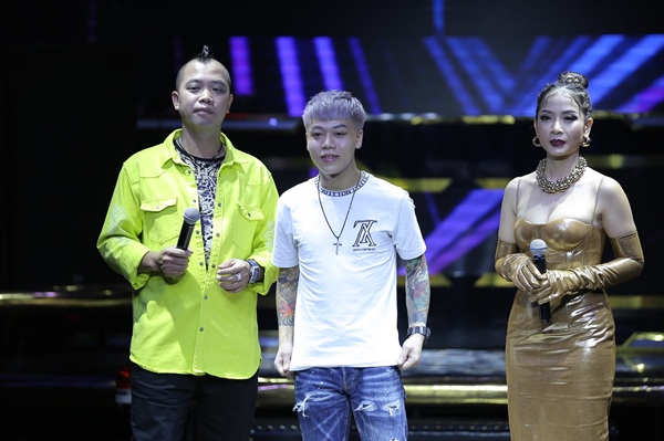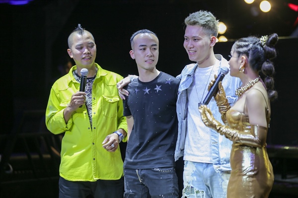 DJ Kenzo (áo đen) được HLV Bình Mèo (thứ 2 từ phải sang) lên tận sân khấu đón về đội mình