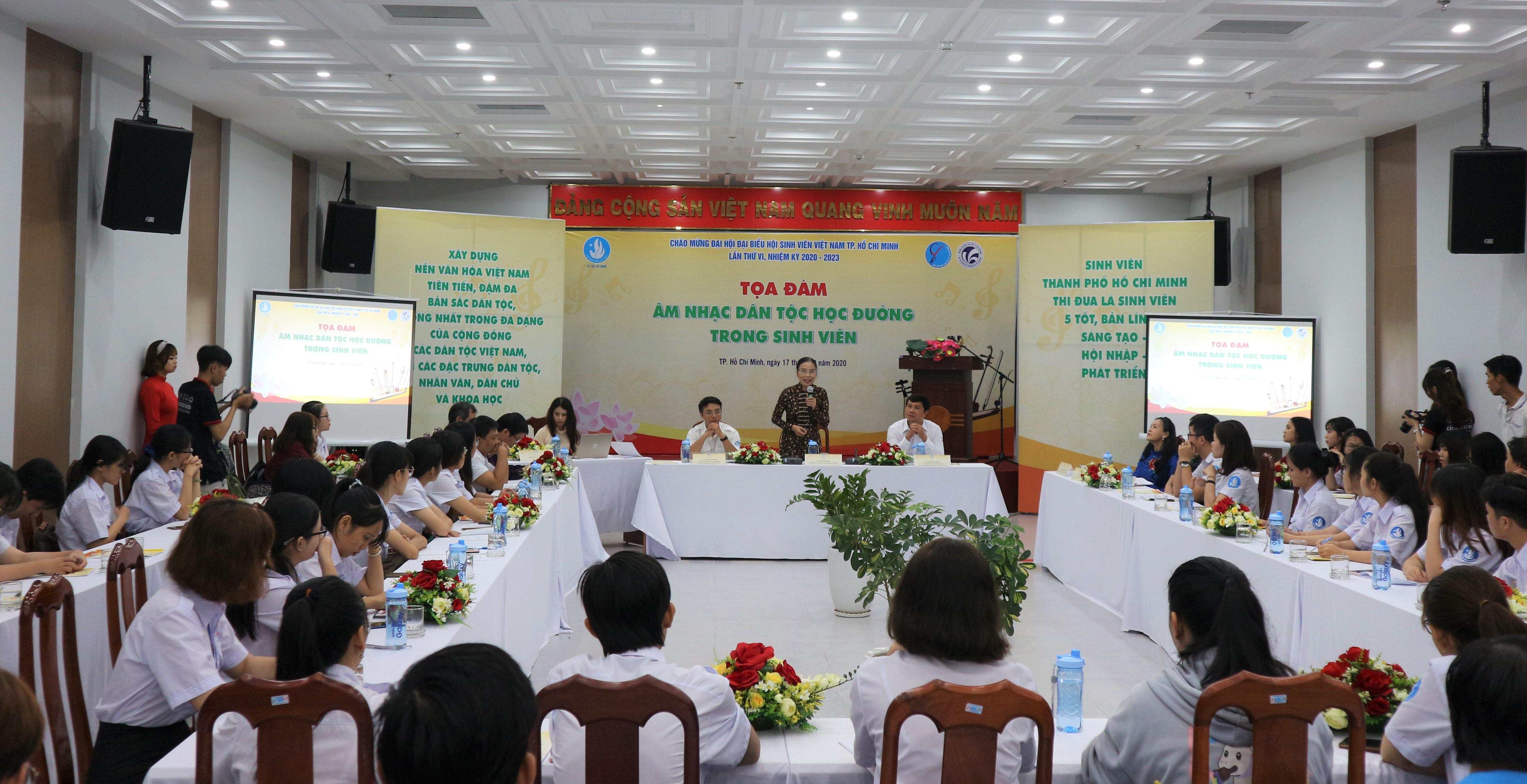 Tiếp nối thành công chuỗi hoạt động của chương trình năm nay, toạ đàm “Âm nhạc dân tộc học đường trong học sinh, sinh viên” với sự tham dự của các đơn vị có chuyên môn cao về âm nhạc dân tộc và các chuyên gia có nhiều kinh nghiệm nghiên cứu về các thể loại âm nhạc truyền thống như: NSƯT Ngô Tuyết Mai, NSƯT Huỳnh Khải, NSƯT Hải Phượng, TS Mai Mỹ Duyên... Toạ đàm đã mang đến những kiến thức về âm nhạc dân tộc, tình hình phát triển và vai trò của âm nhạc dân tộc học đường trong đời sống nói chung và giới trẻ nói riêng. Đồng thời, tại toạ đàm các chuyên gia khách mời và các đơn vị chuyên môn đã tiến hành trao đổi về thực trạng của việc thực hiện chương trình “Âm nhạc dân tộc học đường” giai đoạn 2015 – 2020 qua đó gợi hướng mô hình, giải pháp phát triển âm nhạc dân tộc học đường trong sinh viên nhiệm kỳ VI (2020 – 2023).