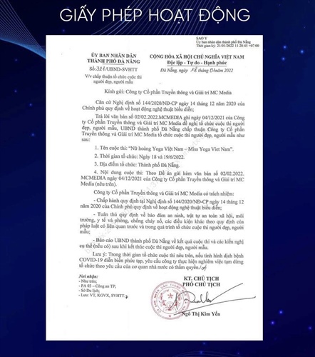Văn bản của UBND thành phố Đà Nẵng chấp thuận cho Công ty cổ phần truyền thông và giải trí MC Media tổ chức cuộc thi “Nữ hoàng Yoga Việt Nam - Miss Yoga Việt Nam”