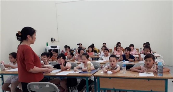 Nghệ nhân Ưu tú Kim Dung dạy các em nhỏ trong Câu lạc bộ dân ca làng Mọc Quan Nhân
