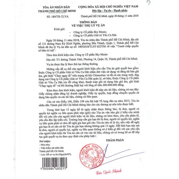 Ngày 27/12/2018, Tòa án nhân dân TP.HCM đã tống đạt Thông báo số 189/TB-TLVA về việc thụ lý vụ án dân sự số 189/2018/TLST-KDTM về “Tranh chấp quyền sở hữu trí tuệ” để giải quyết các yêu cầu sau của SKY Music: