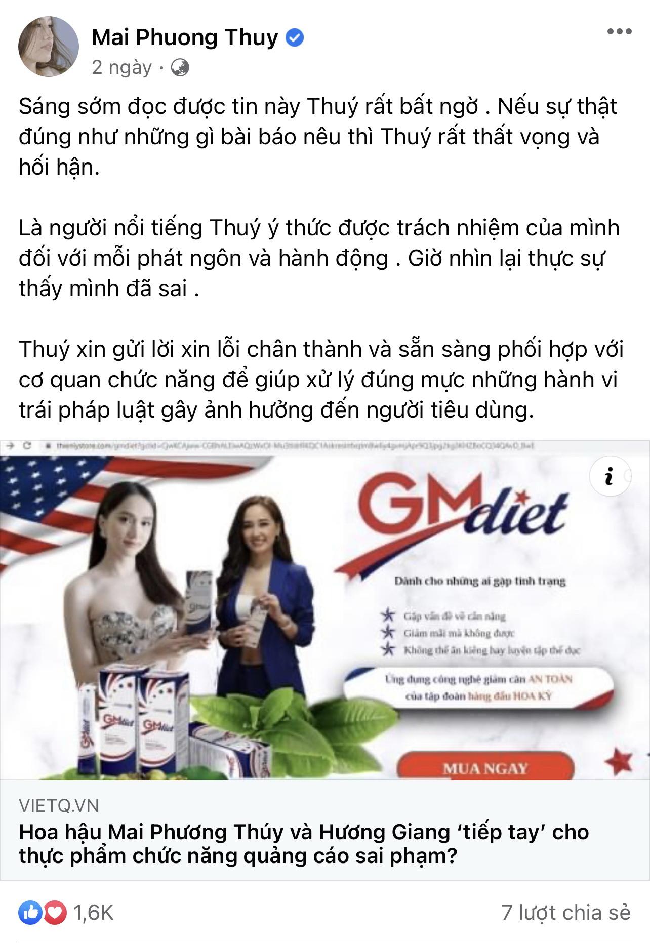 Hoa hậu này chia sẻ: “Sáng sớm đọc được tin này Thuý rất bất ngờ. Nếu sự thật đúng như những gì bài báo nêu thì Thuý rất thất vọng và hối hận. Là người nổi tiếng, Thuý ý thức được trách nhiệm của mình đối với mỗi phát ngôn và hành động. Giờ nhìn lại thực sự thấy mình đã sai. Thuý gửi lời xin lỗi chân thành và sẵn sàng phối hợp với cơ quan chức năng để giúp xử lý đúng mực những hành vi trái pháp luật gây ảnh hưởng đến người tiêu dùng”. Nội dung bài viết nêu 2 Hoa hậu đã tham gia PR cho thương hiệu thực phẩm chức năng giảm cân. Đây là sản phẩm đã bị cơ quan chức năng xử phạt và thu hồi giấy phép vào đầu tháng 6 vừa qua do quảng cáo sai sự thật. Phía Cục Thương mại điện tử và Kinh tế số (Bộ Công thương) cũng ra khuyến cáo người dân không mua, sử dụng sản phẩm nêu trên và báo cáo với cơ quan chức năng nếu phát hiện tổ chức, cá nhân có bán các sản phẩm này.
