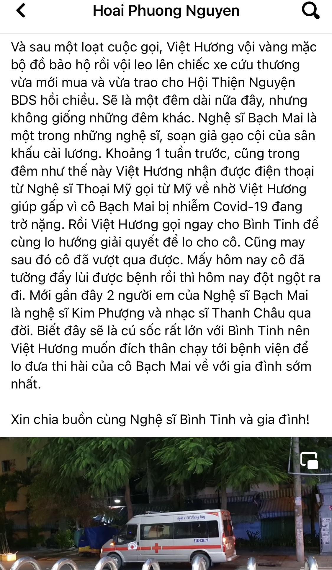 Nhạc sĩ Hoài Phương, ông xã nghệ sĩ Việt Hương cho biết, vợ mình nhận được điện thoại từ Bình Tinh vào 12 giờ đêm báo tin nghệ sĩ Bạch Mai qua đời. Vì dịch bệnh, lại không biết làm gì hơn nên Bình Tinh đành phải nhờ Việt Hương dùng xe cứu thương giúp mình đưa mẹ về nhà để lo hậu sự. “Và sau một loạt cuộc gọi, Việt Hương vội vàng mặc bộ đồ bảo hộ rồi leo lên chiếc xe cứu thương vừa mới mua và vừa trao cho Hội Thiện Nguyện hồi chiều. Sẽ là một đêm dài nữa đây, nhưng không giống những đêm khác”, Hoài Phương xúc động.