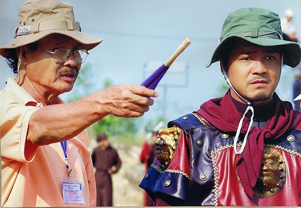 NSND Lý Huỳnh và con trai - tài tử Lý Hùng trên trường quay Tây Sơn hào kiệt. Ảnh tư liệu của gia đình