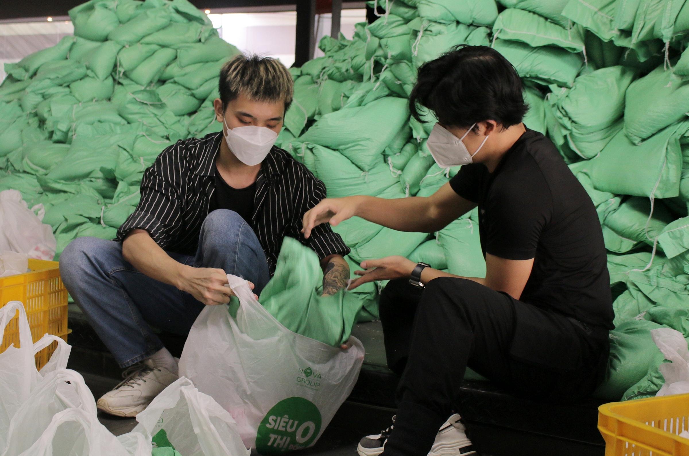 Nhạc sĩ Nguyễn Văn Chung (bên phải) và đồng nghiệp đóng gói lương thực hỗ trợ đồng bào khó khăn