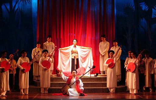 NSND Trung Hiếu, Giám đốc nhà hát kịch Hà Nội đọc điếu văn truy điệu NSND Hoàng Dũng trong khung cảnh phía sau dàn nghệ sĩ mặc trang phục trong vở Tiếng đàn vùng Mê Thảo