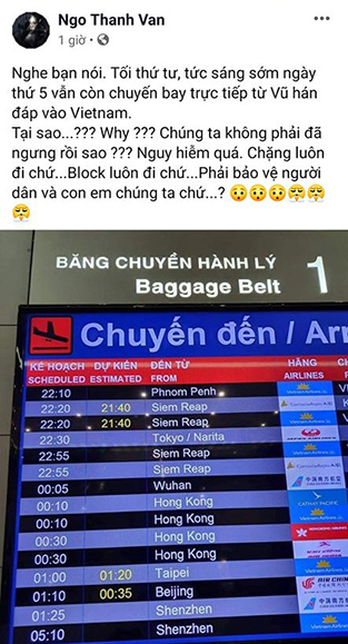 Trước đó, ngày 26.1.2020, trên trang Fanpage Đàm Vĩnh Hưng chia sẻ thông tin hai người Trung Quốc bị nhiễm virus corona đã chết tại Bệnh viện Chợ Rẫy. Thông tin này sau đó đã được xóa bỏ, chỉ còn giữ lại các chia sẻ mang tính cảnh báo về nguy cơ gây bệnh. Cũng trong ngày 26.1, nghệ sĩ Cát Phượng chia sẻ trên trang cá nhân: “Biết nói gì đây? Làm ơn nghĩ cho dân trước cũng là nghĩ cho chính bản thân mình. Dịch bệnh đã đến Q.1, rồi sẽ lan tràn đến Q.3, Q.5, Q.7…”. Tiếp đó, nghệ sĩ kêu gọi khán giả mua và dùng khẩu trang lọc khí thông minh AirPlus “cho an toàn”. Và vào sáng 31.1, diễn viên Ngô Thanh Vân cập nhật trạng thái trên fanpage về tình trạng hãng hàng không vẫn có chuyến bay từ Vũ Hán về Việt Nam giữa đại dịch virus corona trong khi trước đó Cục hàng không đã dừng cấp phép các chuyến bay từ Việt Nam đi Vũ Hán và ngược lại. Chia sẻ này của nữ diễn viên đã bị cộng đồng mạng phản ứng…