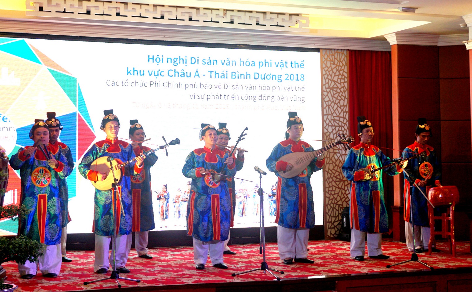 Các nghệ sĩ của Nhà hát Nghệ thuật Truyền thống Cung đình Huế biểu diễn Nhã nhạc tại một hội thảo quốc tế. Ảnh: S.Thùy