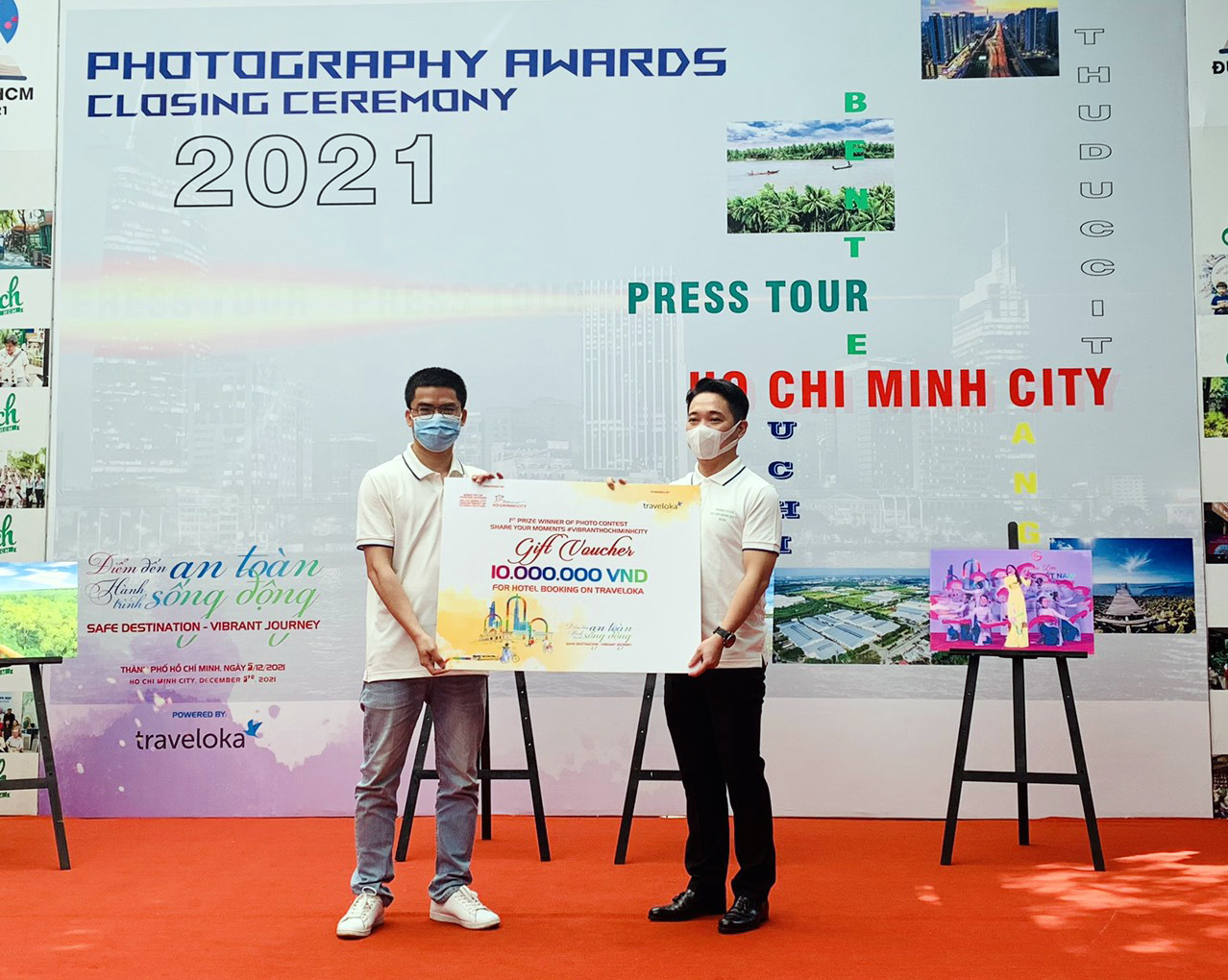 Ông Lê Trương Hiền Hoà, Phó Giám đốc Sở Du lịch TP.HCM (bên phải) trao giải Nhất cho tác giả là phóng viên nước ngoài