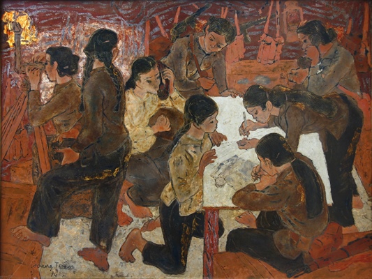 Dân quân gái Ngư Thuỷ ,1974, Sơn mài, Hoàng Trầm