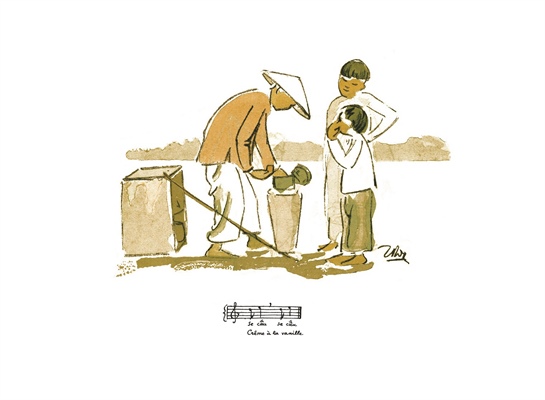 10 bức phác thảo đen trắng được in trên giấy dó, đưa vào trong các hộp treo nhấp nhô trên tường, có lắp bóng đèn bên trong để công chúng có thể nhìn được cả những vân giấy dó tuyệt đẹp nổi lên cùng những nét vẽ đầy rung cảm. Các nghệ sĩ khắc họa tài tình thế giới bé nhỏ của những gánh hàng rong đang rảo bước khắp các con phố Thủ đô, dưới tia nắng đầu tiên trong ngày cùng các gánh hàng rau quả, kẹo bánh và đồ ăn vặt đa dạng… Chảy qua gần một thế kỷ, khung cảnh đường phố Hà Nội hiện lên đôi khi chỉ trong vài đường nét. Ấy là chuyển động đung đưa, tao nhã để giữ gánh hàng thăng bằng, là dáng nghiêng nghiêng của người bán hàng khi lấy kem cho những đứa trẻ đang nóng lòng chờ đợi.