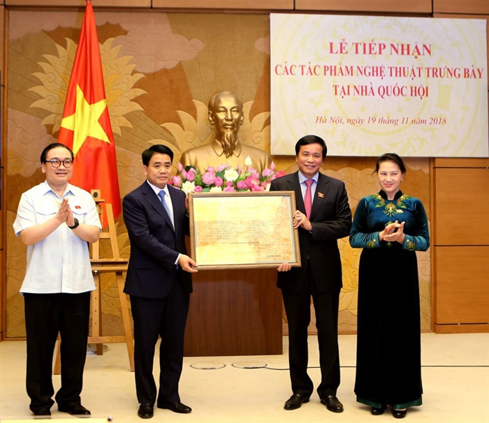 Chủ tịch Quốc hội Nguyễn Thị Kim Ngân, Chủ nhiệm Văn phòng Quốc hội Nguyễn Hạnh Phúc tiếp nhận các tác phẩm nghệ thuật tại đường hầm Nhà Quốc hội từ Bí thư Thành ủy Hà Nội Hoàng Trung Hải và Chủ tịch UBND TP Hà Nội Nguyễn Đức Chung