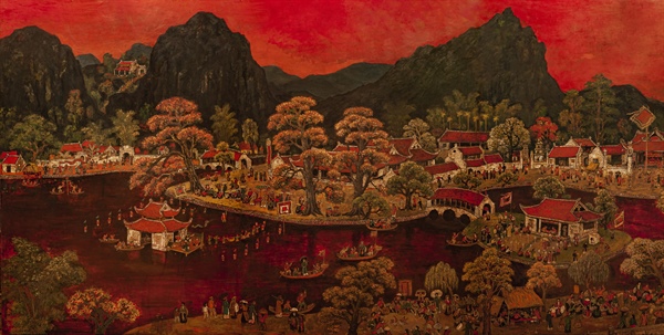 Tranh sơn mài "Lễ hội chùa Thầy", tác phẩm đã được họa sĩ  thực hiện  trong nhiều năm.