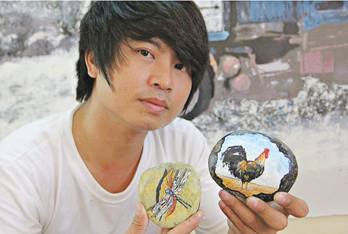 Anh Đậu Quang Thành bên những tác phẩm tranh trên đá cuội của mình