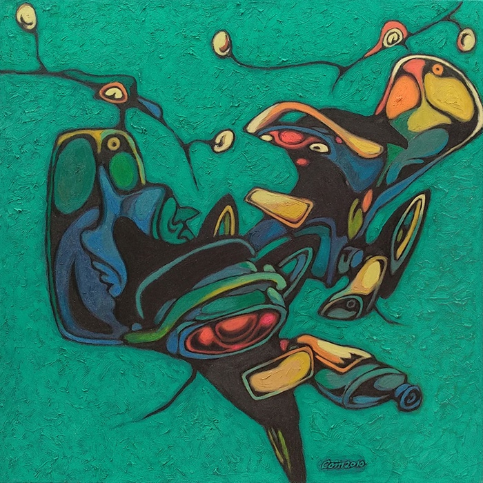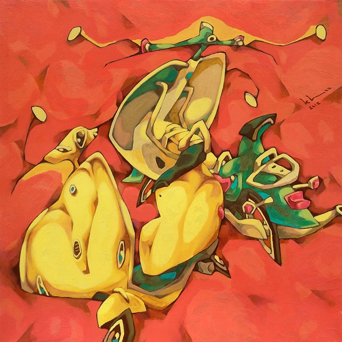 Xuất phát từ ý tưởng này, đầu năm 2009, cách đây đúng gần 10 năm, anh bắt đầu vẽ bức tranh đầu tiên về đề tài này. Dùng thủ pháp cường điệu, Hữu Khoa biến hình ảnh những chiếc xe máy không còn có dáng vẻ thật thà như nó vốn có. Những chiếc xe vui vẻ, tung tẩy như những con người.