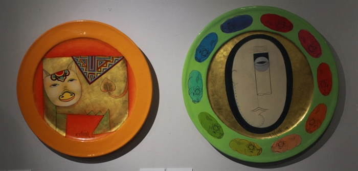 Hai tác phẩm “Lợn mán” va “Tự họa năm Hợi”, sơn mài, của họa sĩ Thành Chương