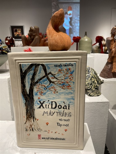 Bìa sách Xứ Đoài Mây trắng (cố nhà văn Nguyễn Sơn Đỗng) được sáng tạo trên chất liệu gốm của nữ họa sĩ Kim Đức