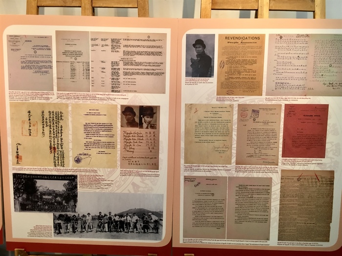 120 tư liệu được trưng bày tại triển lãm. Theo Phó chủ tịch Hội người Việt Nam tại Pháp Nguyễn Văn Bổn, người trực tiếp phụ trách việc tìm kiếm tư liệu, lần đầu tiên có thể làm triển lãm về chủ tịch Hồ Chí Minh với những tư liệu về những người thân của Bác, cũng với những hồ sơ và tài liệu mật về những người Việt Nam yêu nước bị Pháp điều tra, theo dõi.