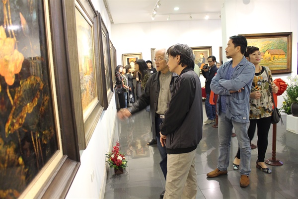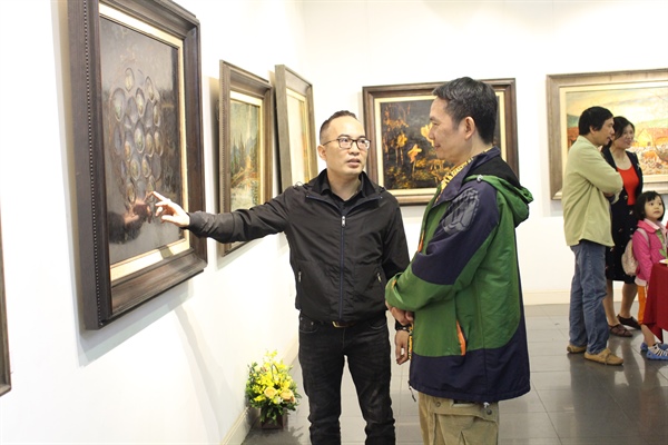 Nhiều họa sĩ, nghệ sĩ và khán giả yêu tranh đến thưởng thức các tác phẩm sơn mài tại Triển lãm