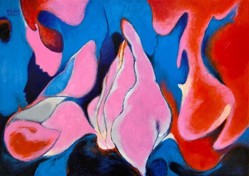 Cùng chung cảm hứng về sự ấm áp, lạc quan, Phố hồng mang những đường nét rực rỡ, gợi mở, bình yên… còn Hoa xuân gợi lên sự tinh khôi, tươi mới và lãng mạn. Hầu hết những bức tranh đều được nhà sưu tập Thúy Anh sở hữu trong giai đoạn đại dịch Covid-19. Ở chính giai đoạn khó khăn, thử thách nhất, các họa sĩ cũng dành nhiều thời gian, trăn trở để sáng tạo. Ngoài phản ánh hiện thực đời sống, tinh thần lan tỏa sức sống, niềm tin bằng những gam màu tươi mới, hiện đại… cũng được giới họa sĩ chú trọng.