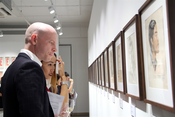 Góc trưng bày các tác phẩm ký họa chân dung về các chiến sĩ bộ đội của họa sĩ Chu Thảo, thu hút khách nước ngoài