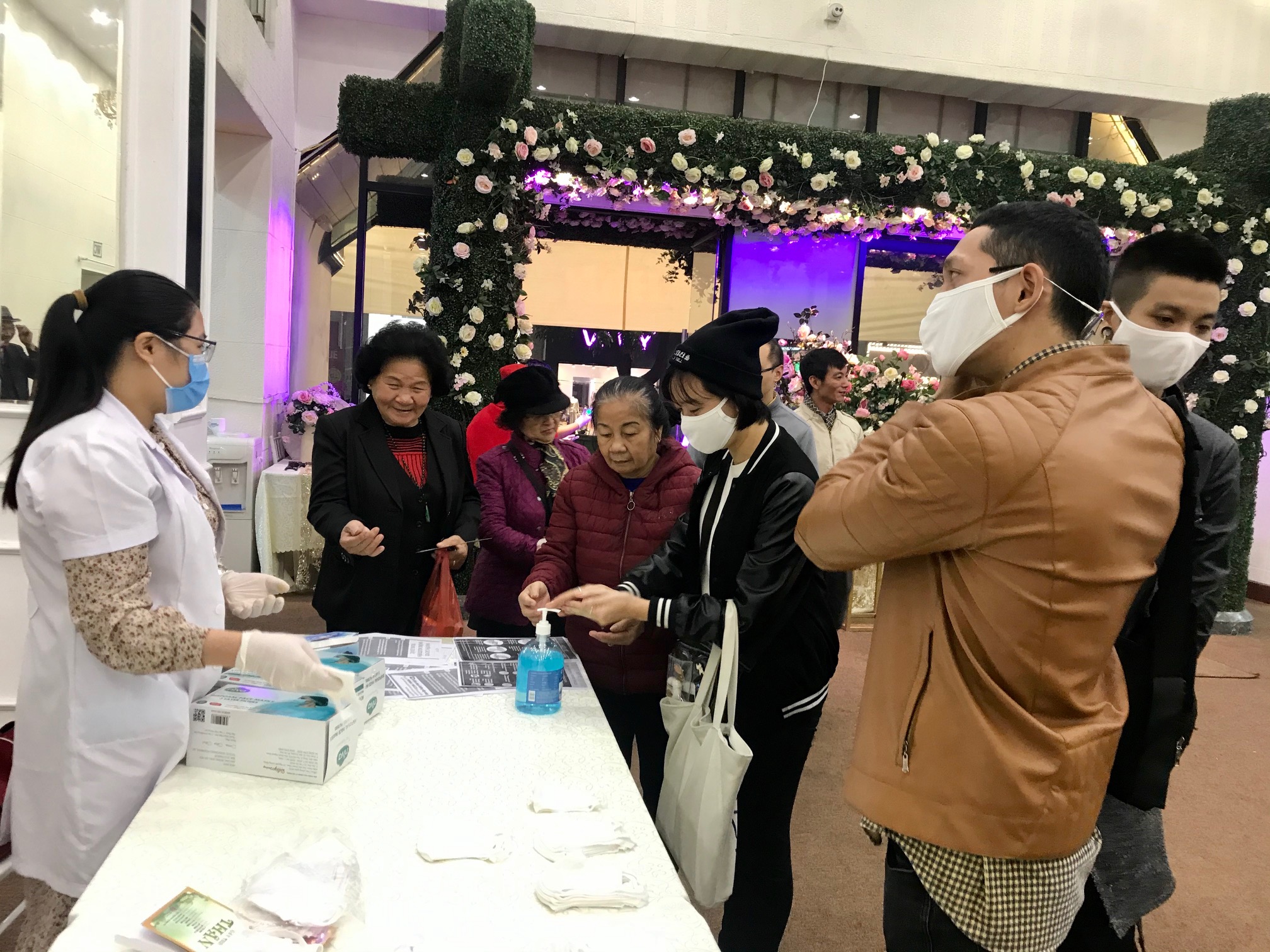 Khán giả rửa tay sát khuẩn và đeo khẩu trang trước khi vào xem