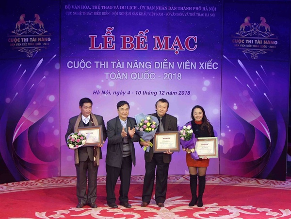 Quyền Cục trưởng Cục Nghệ thuật biểu diễn, NSND Nguyễn Quang Vinh; Chủ tịch Hội Nghệ sĩ Sân khấu VN, NSND Lê Tiến Thọ trao Giải nhất cho các nghệ sĩ