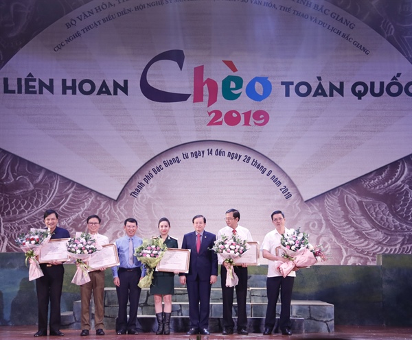 | Liên hoan phản ánh đúng thực trạng của nghệ thuật chèo Liên hoan Chèo toàn quốc 2019 diễn ra tại Thành phố Bắc Giang, tỉnh Bắc Giang từ ngày 14 đến ngày 28.9 đã kết thúc thành công tốt đẹp. Trải qua 14 ngày, chúng ta được thưởng thức 26 vở diễn với sự tìm tòi, sáng tạo, đua tài hào hứng, sôi nổi, lòng say mê nghề nghiệp, ý thức trách nhiệm cao, tạo nên sức truyền cảm và ấn tượng sâu sắc, những giá trị thẩm mỹ đến với người xem. (Thứ trưởng Bộ VHTTDL TẠ QUANG ĐÔNG) |