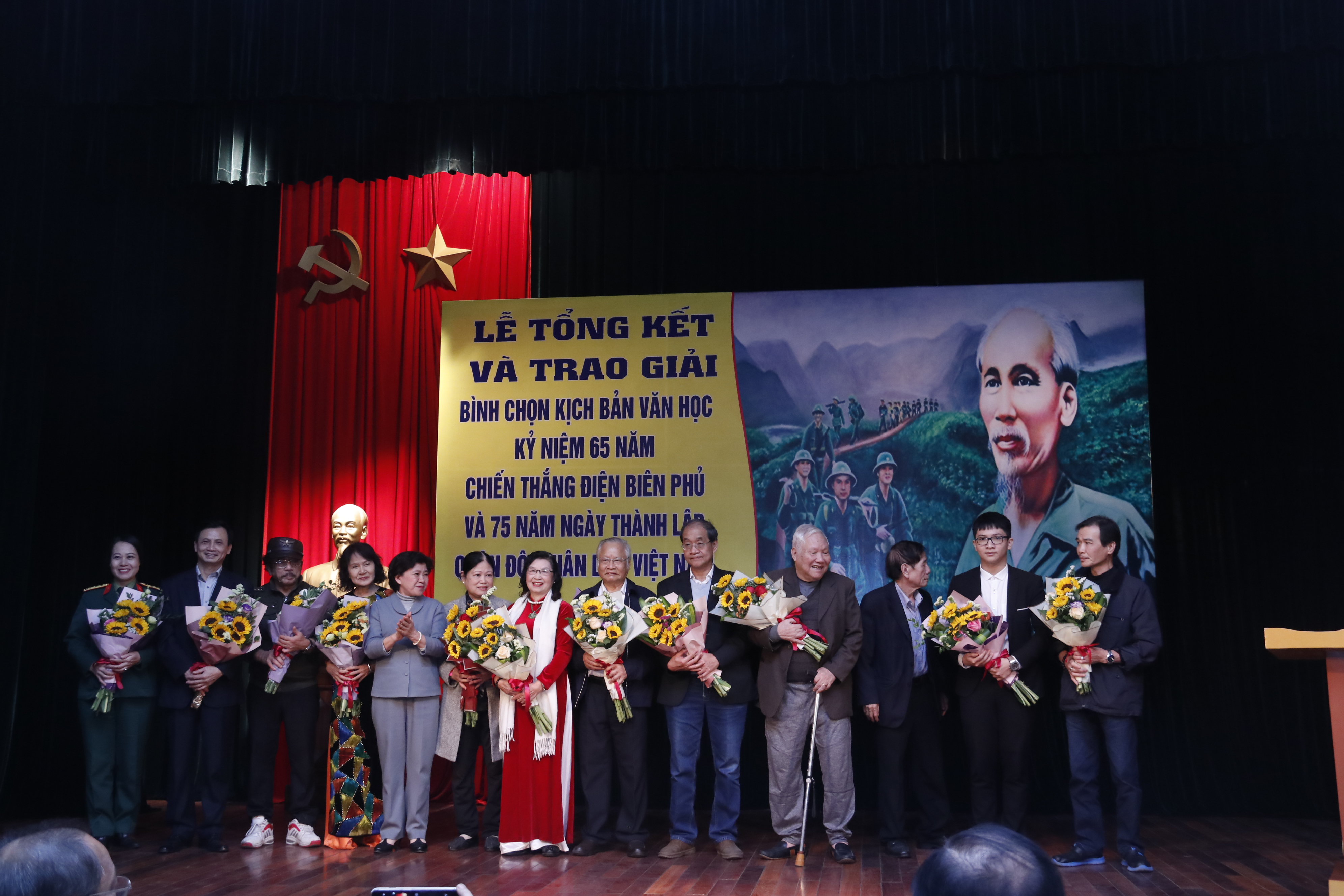 Phó Chủ nhiệm Ủy ban VH,GD,TN,TN&NĐ của Quốc hội Hoàng Thị Hoa và Chủ tịch Liên hiệp các Hội VHNT Việt Nam, nhà thơ Hữu Thỉnh tặng hoa cho các tác giả và thân nhân tác giả được trao Giải thưởng Nhà nước, Giải thưởng Hồ Chí Minh về VHNT