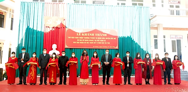 Các đại biểu và các nhà tài trợ cắt băng khánh thành Thư viện thân thiện Trường PTDTBT Tiểu học xã Minh Sơn, huyện Bắc Mê, tỉnh Hà Giang