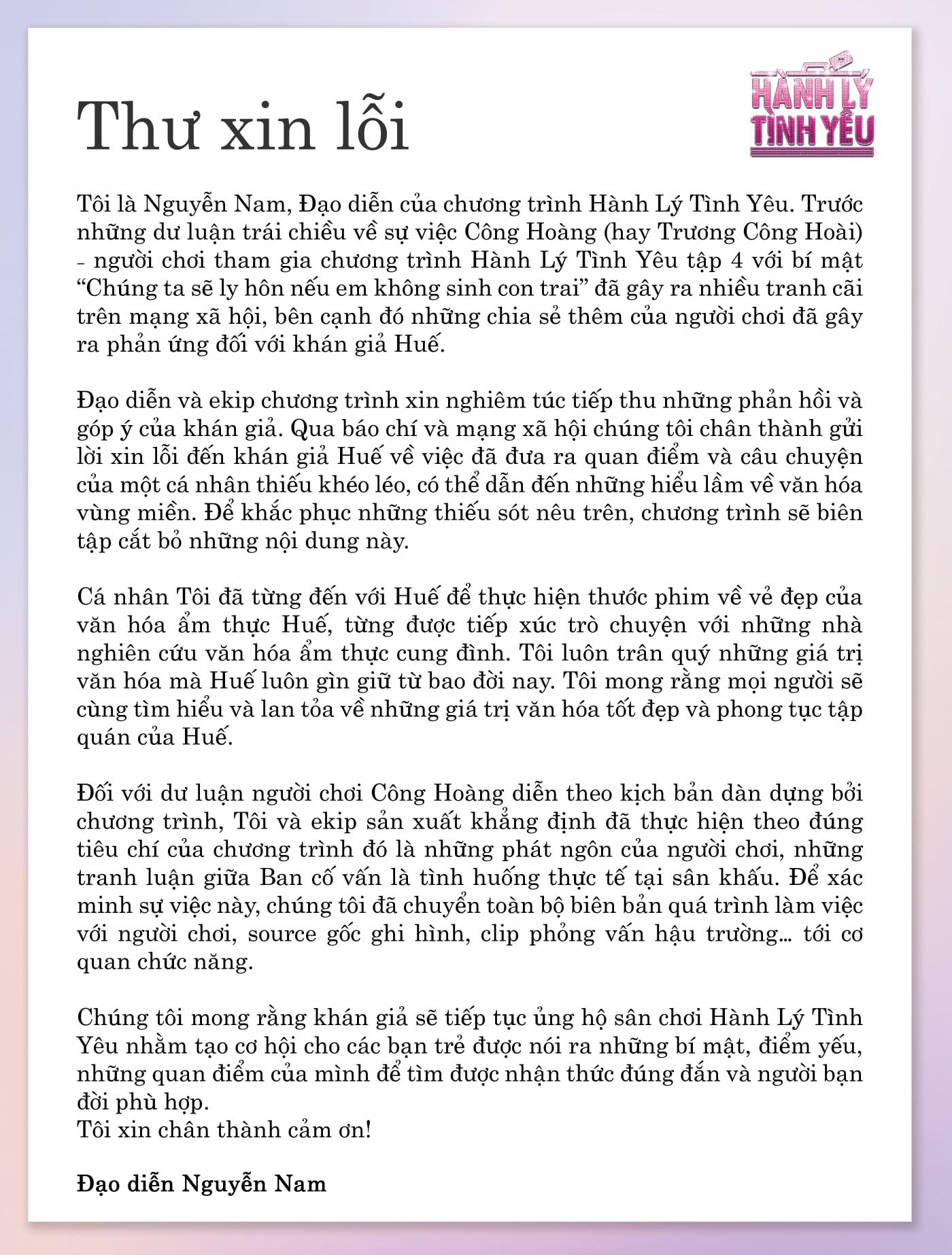 Trong thư, ông Nguyễn Nam nhận lỗi với khán giả và người dân Huế về những lùm xùm thời gian qua khởi phát từ thí sinh Công Hoàng. Nam đạo diễn chia sẻ: “Đạo diễn và ê-kíp chương trình xin nghiêm túc tiếp thu những phản hồi và góp ý của khán giả. Qua báo chí và mạng xã hội chúng tôi chân thành gửi lời xin lỗi đến khán giả Huế về việc đã đưa ra quan điểm và câu chuyện của một cá nhân thiếu khéo léo, có thể dẫn đến những hiểu lầm về văn hóa vùng miền. Để khắc phục những thiếu sót nêu trên, chương trình sẽ biên tập cắt bỏ những nội dung này”.